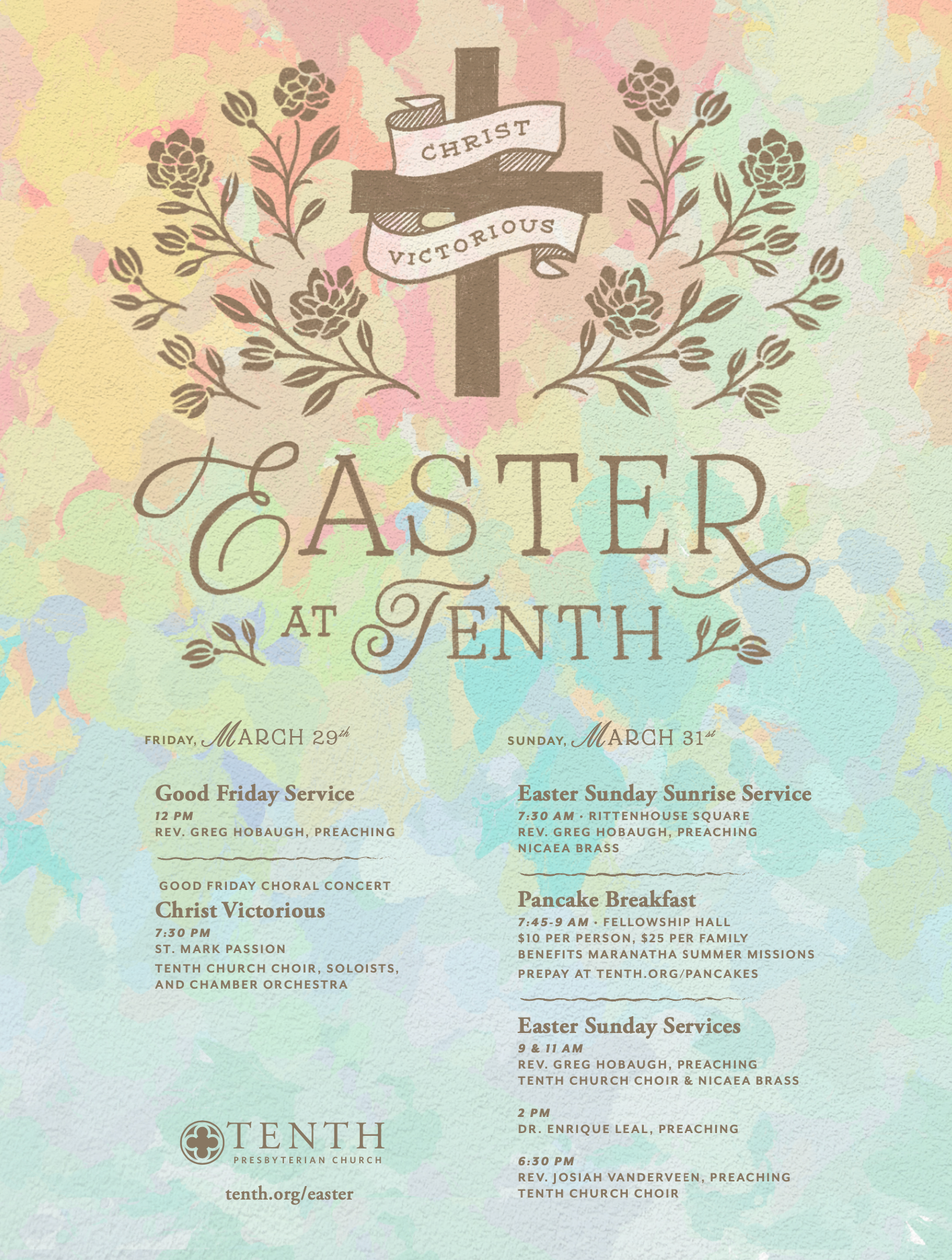 This poster design was created for Tenth Presbyterian Church for their Easter services in 2024. This project included signage for both inside and outside the church, as well as digital assets for web banners and social media posts.